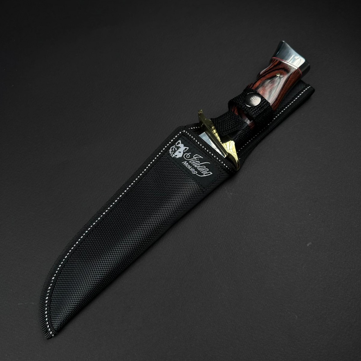 Cuțit cu lamă fixă elegant și robust, cu design clasic tip dagger / Bowie scurt, ideal pentru camping, bushcraft, vânătoare ușoară, drumeții sau protecție personală în natură. Lama de 16 cm oferă echilibru excelent între putere de tăiere și manevrabilitate, fiind precisă la tranșare, jupuire sau pregătire mâncare. Aspectul premium și tradițional vine de la finisajul satinat al lamei inox, mânerul ergonomic din lemn maro cu accente aurii (gardă și capăt pomel detaliat) și teaca textilă rezistentă cu prindere la centură.