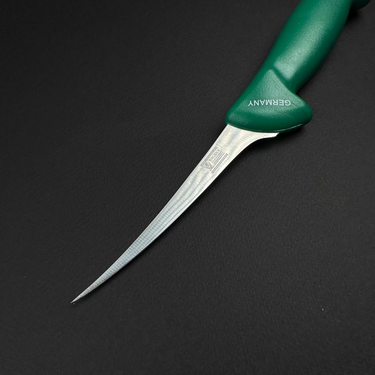 Un cuțit specializat și extrem de precis – combinația de lamă foarte subțire și flexibilă din oțel inoxidabil cu vârf extra ascuțit și mâner verde aderent îl face un tool de încredere pentru filetat profesional și dezosare delicată cu carne / pește crud.