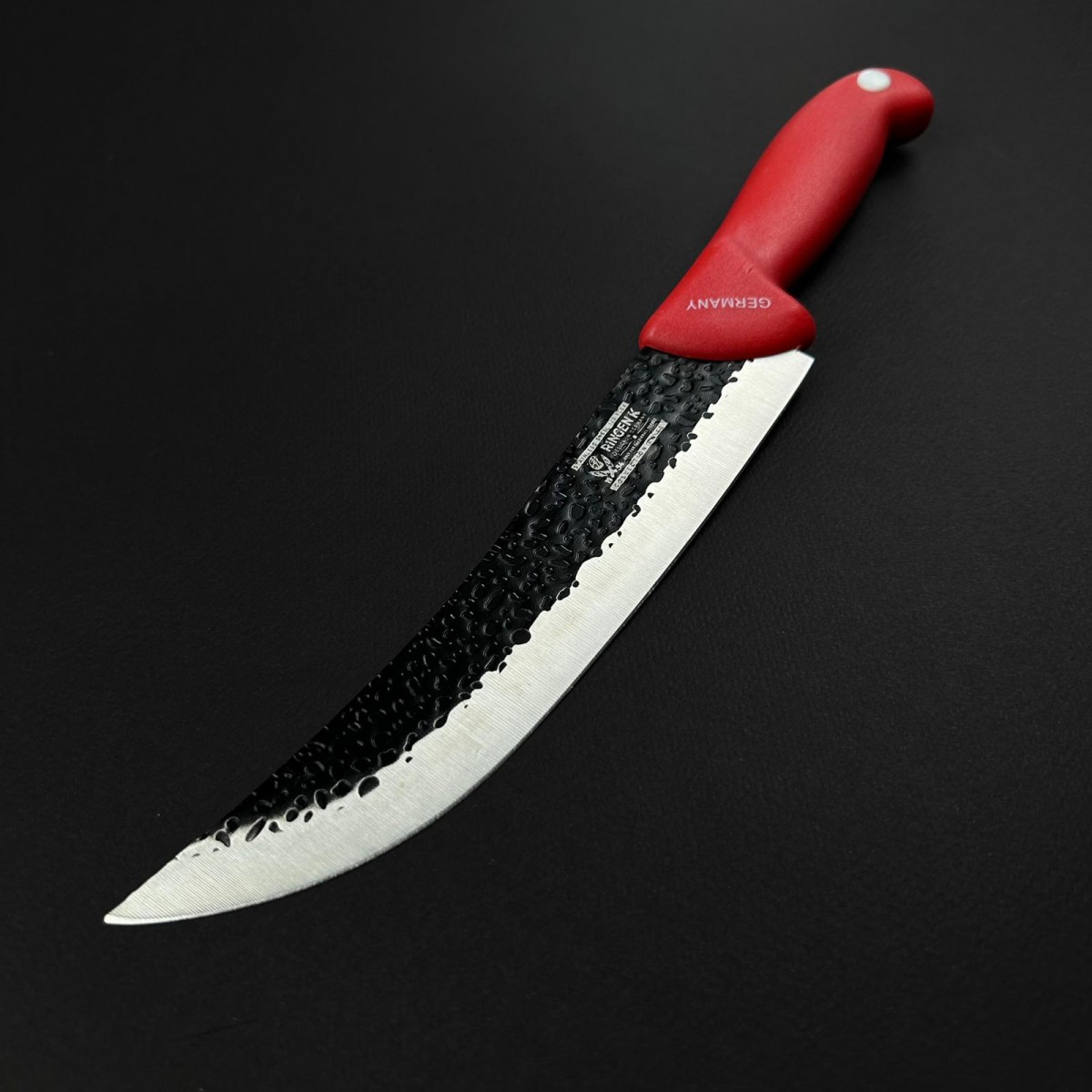 Cuțit bucătarului (chef knife) profesional, cel mai versatil și folosit cuțit în bucătărie, conceput pentru tăiere, feliat, tocare și tranșare în orice activitate culinară sau de măcelărie ușoară. Lama lată, lungă și robustă de 20 cm permite atât lucrări rapide de tocare (legume, carne, ierburi), cât și feliat precis sau tranșare bucăți mai mari. Aspectul autentic și rezistent provine de la finisajul texturat al lamei din fier forjat (efect martelat clasic) și mânerul ergonomic din ABS rosu intens, rezistent la umezeală, grăsimi și alunecare.