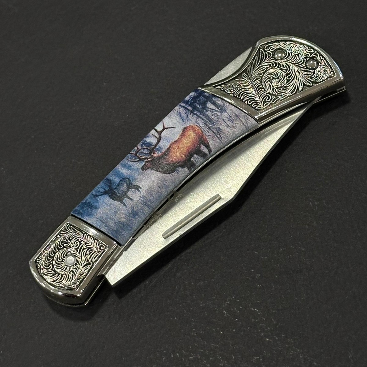 Briceag camping Anima 19 cm, lamă oțel inoxidabil, mâner cu imprimeu tematică vânătoare.