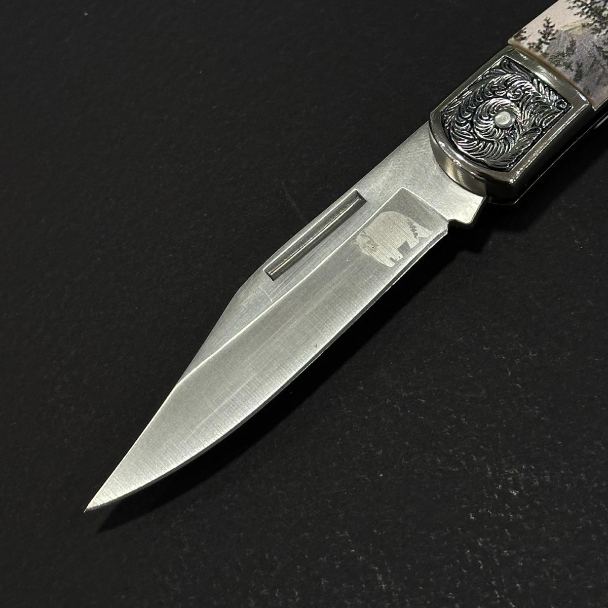 Briceag camping Anima 19 cm, lamă oțel inoxidabil, mâner cu imprimeu tematică vânătoare.