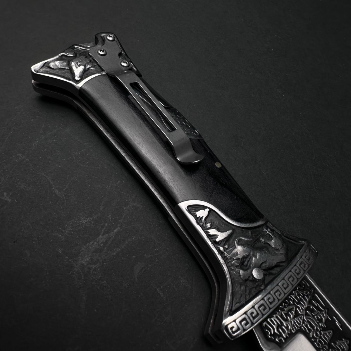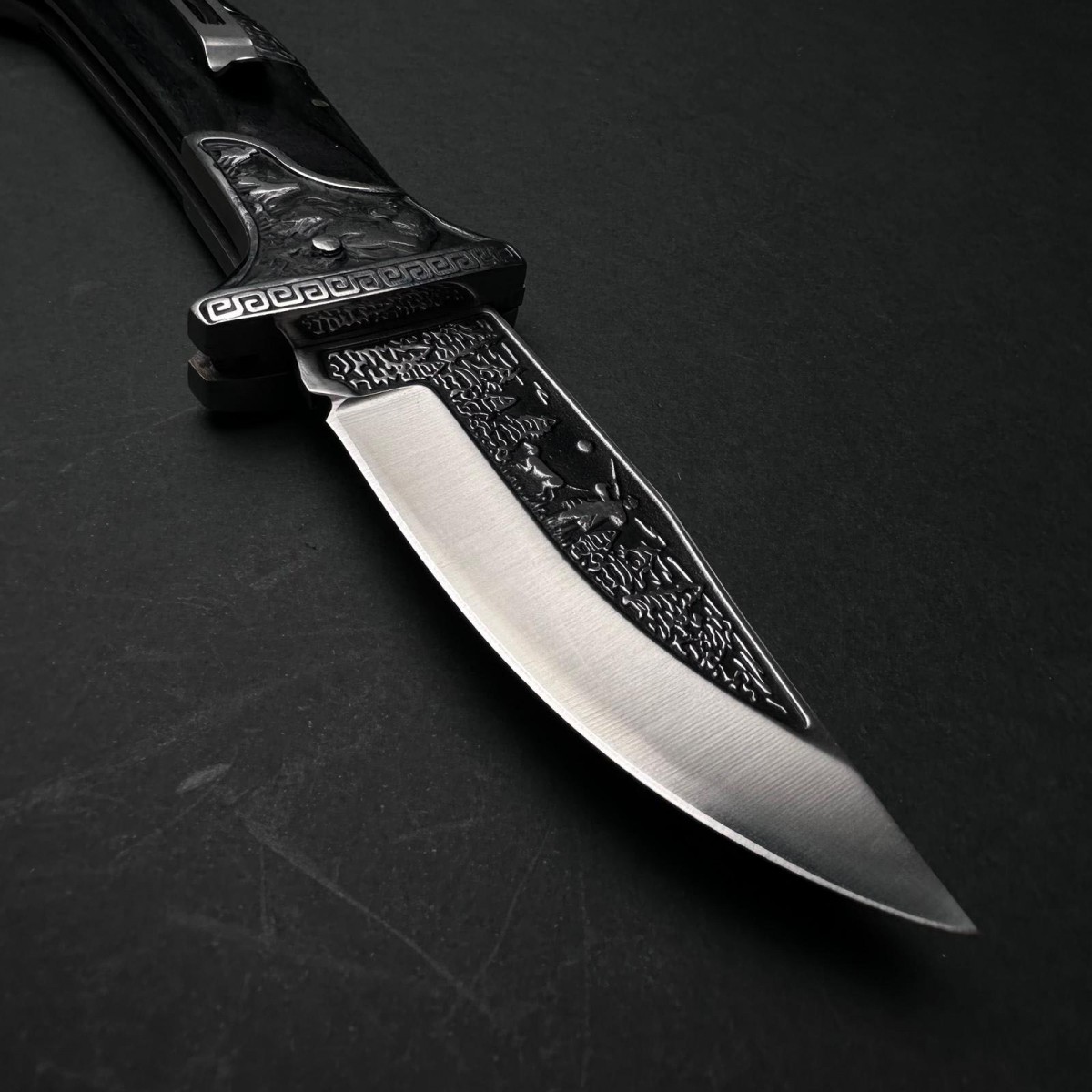 Cuțit cu lamă fixă camping / vânătoare tip dagger artistic – lamă 13 cm oțel inoxidabil gravat, mâne..