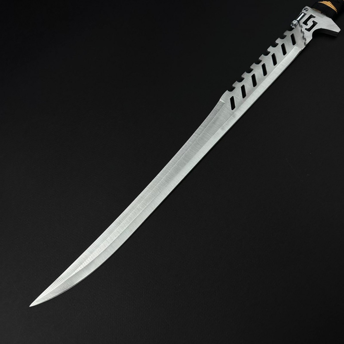 O sabie / cuțit impresionantă și multifuncțională – lama foarte lungă cu dublu tăiș combinată cu mânerul paracord și husa textilă o face un tool esențial pentru situații extreme în natură, oferind putere maximă și versatilitate reală.