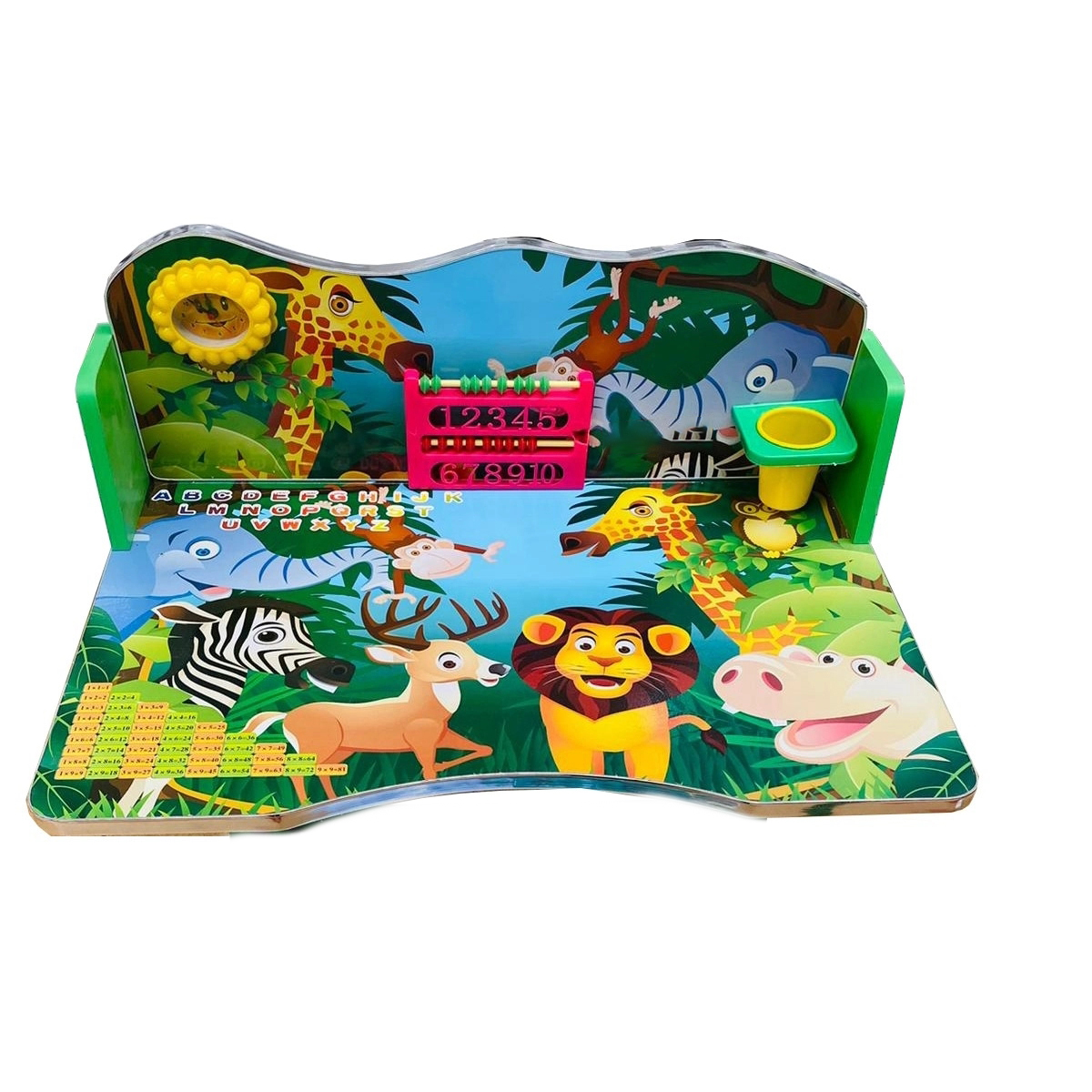 Acest set de birou si scaun este realizat din pal MDF, colantat in culori vii, cu informatii legate de alfabet si tabla inmultirii.