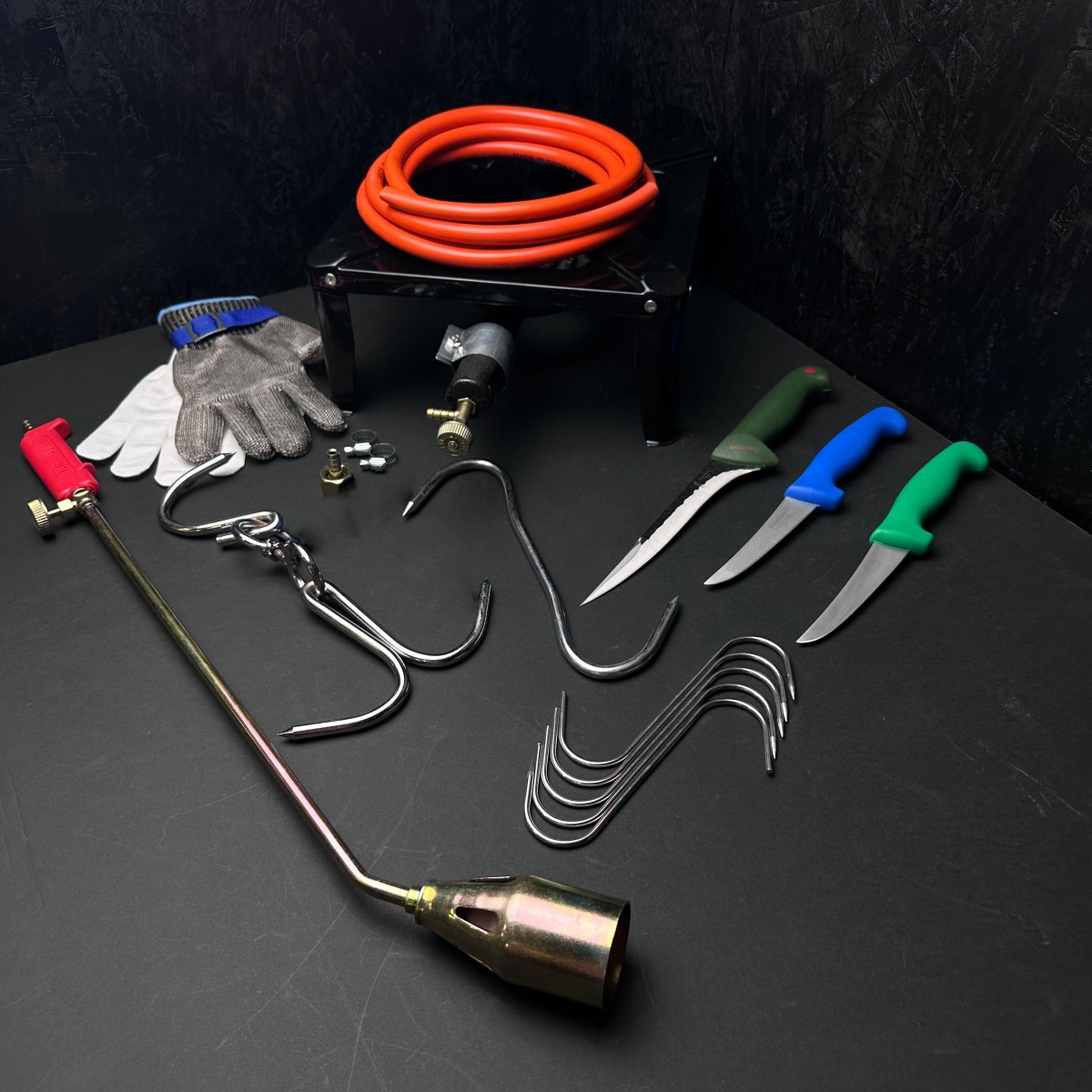 Un set complet și profesional pentru sacrificare, tranșare, pregătirea și manipularea cărnii, ideal pentru gospodării, ferme sau măcelării. Include arzător mare cu clapetă, pirostrie stabilă, cuțite specializate, cârlige multiple pentru agățat carnea și mănușă metalică de protecție – tot ce ai nevoie pentru lucru sigur și eficient.