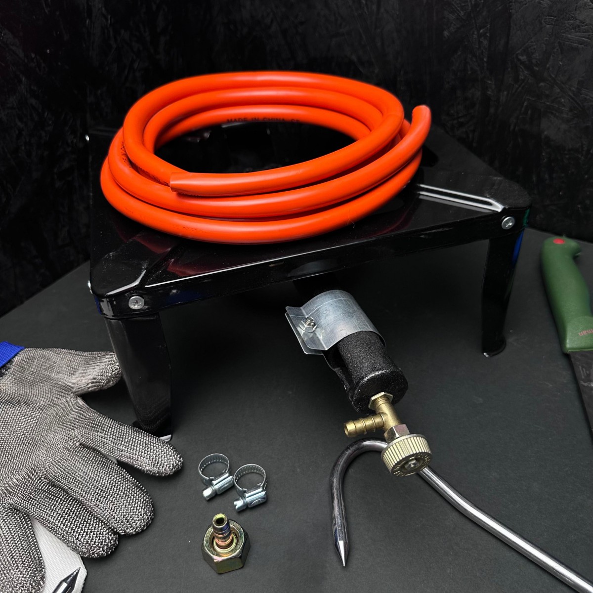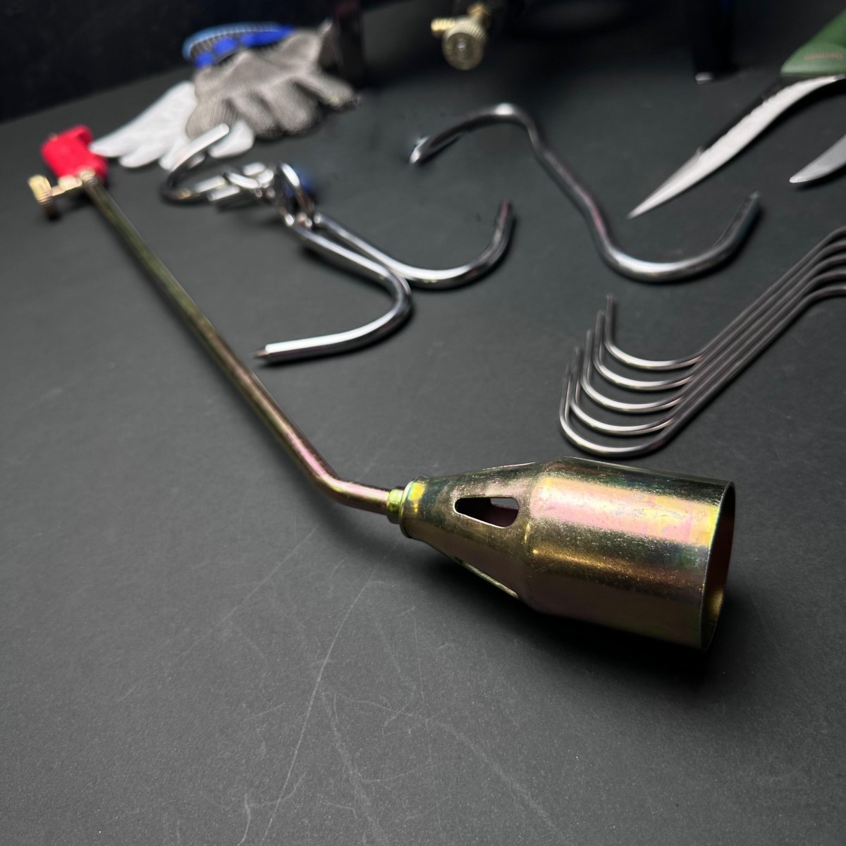 Set Măcelărie 18 Piese – Arzător 70 cm, Pirostrie 40x40 cm, 3 Cuțite Profesionale, 7 Cârlige Diverse, Mănușă Metalică și Furtun Gaz 5m cu Accesorii.