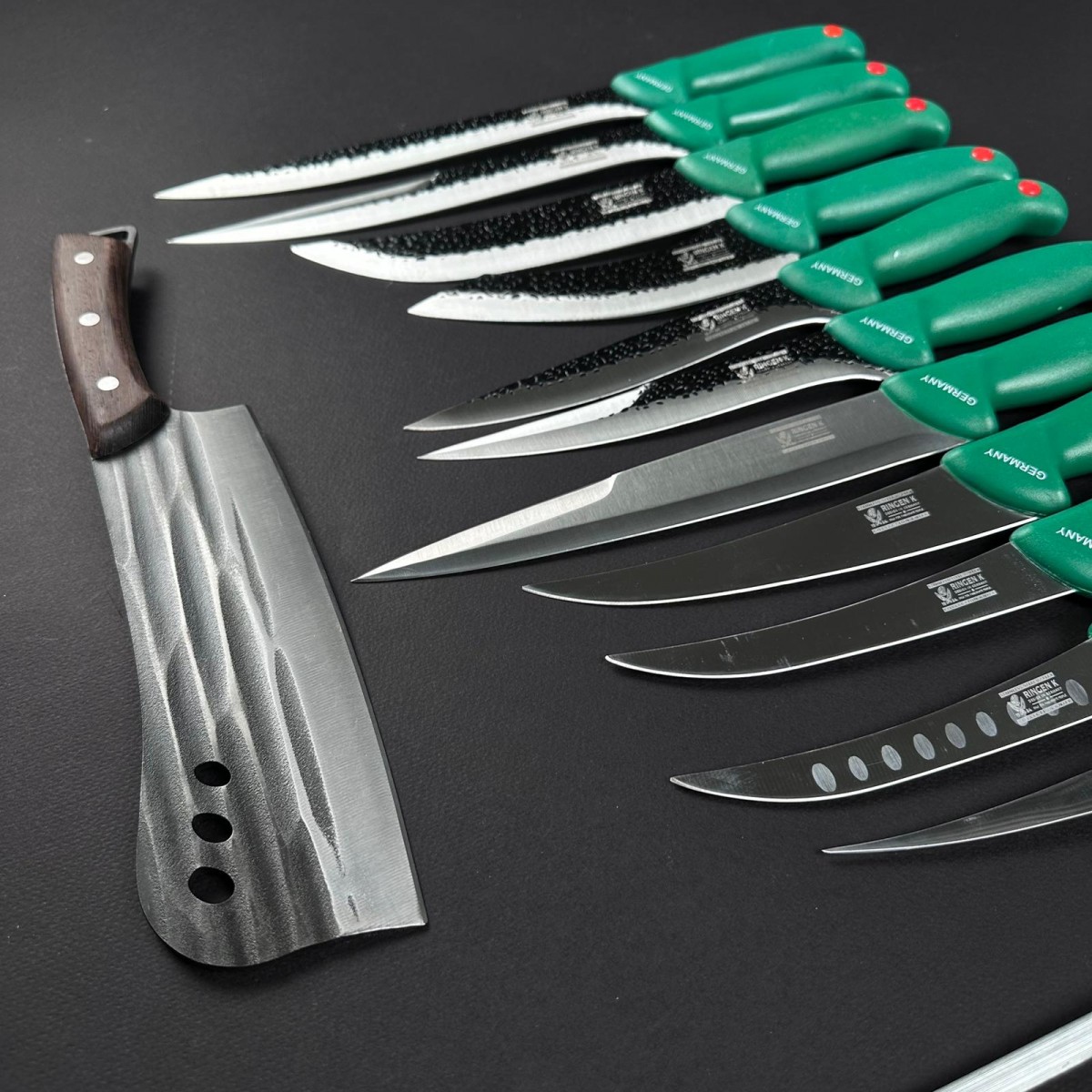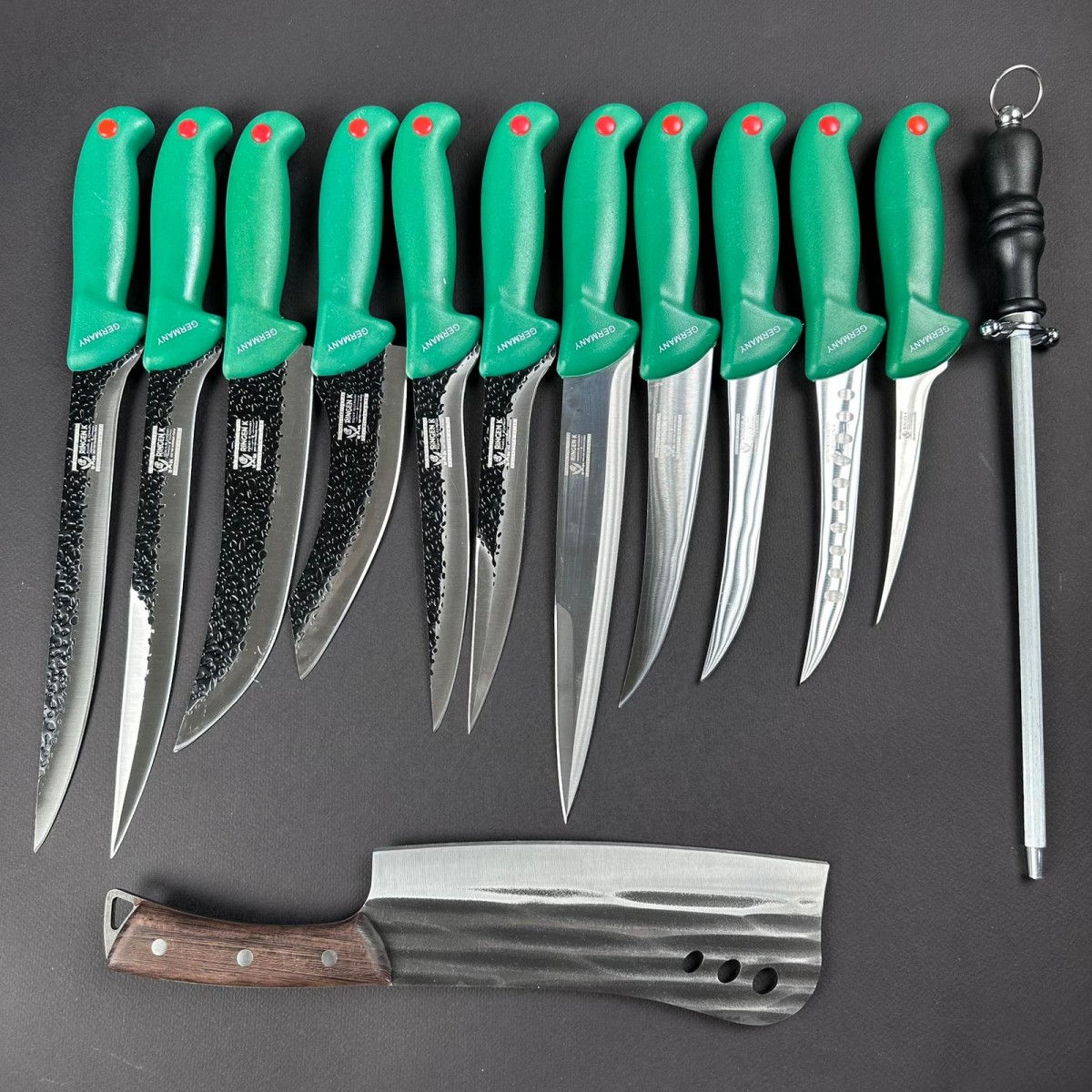 Set Măcelărie Profesional – 13 Piese: Satar, 6 Cuțite Fier Forjat, 5 Cuțite Inox & Pilă Ascuțit (Verde)