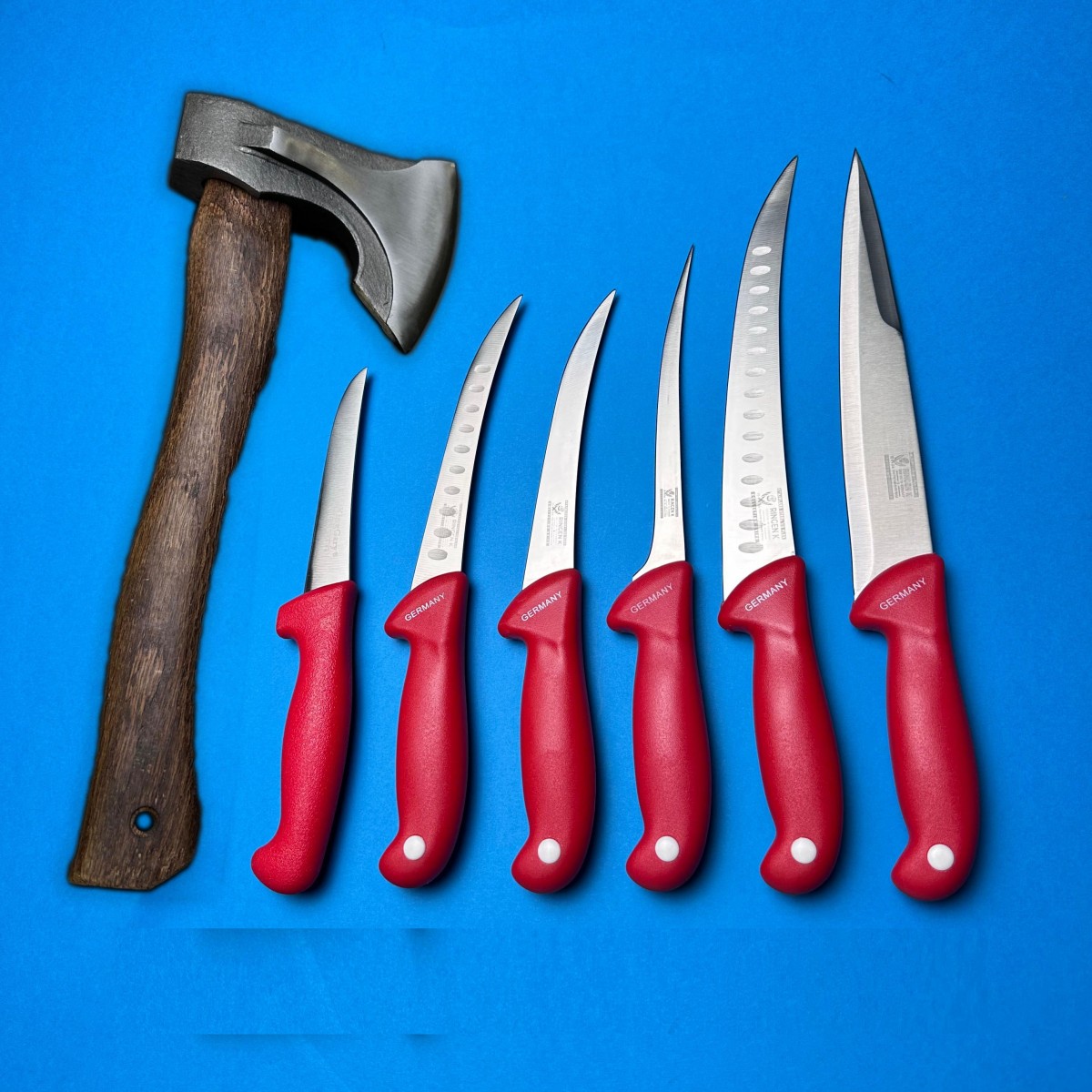 Set macelarie 7 piese, Topor fier forjat, 6 Cutite otel inoxidabil, rosu