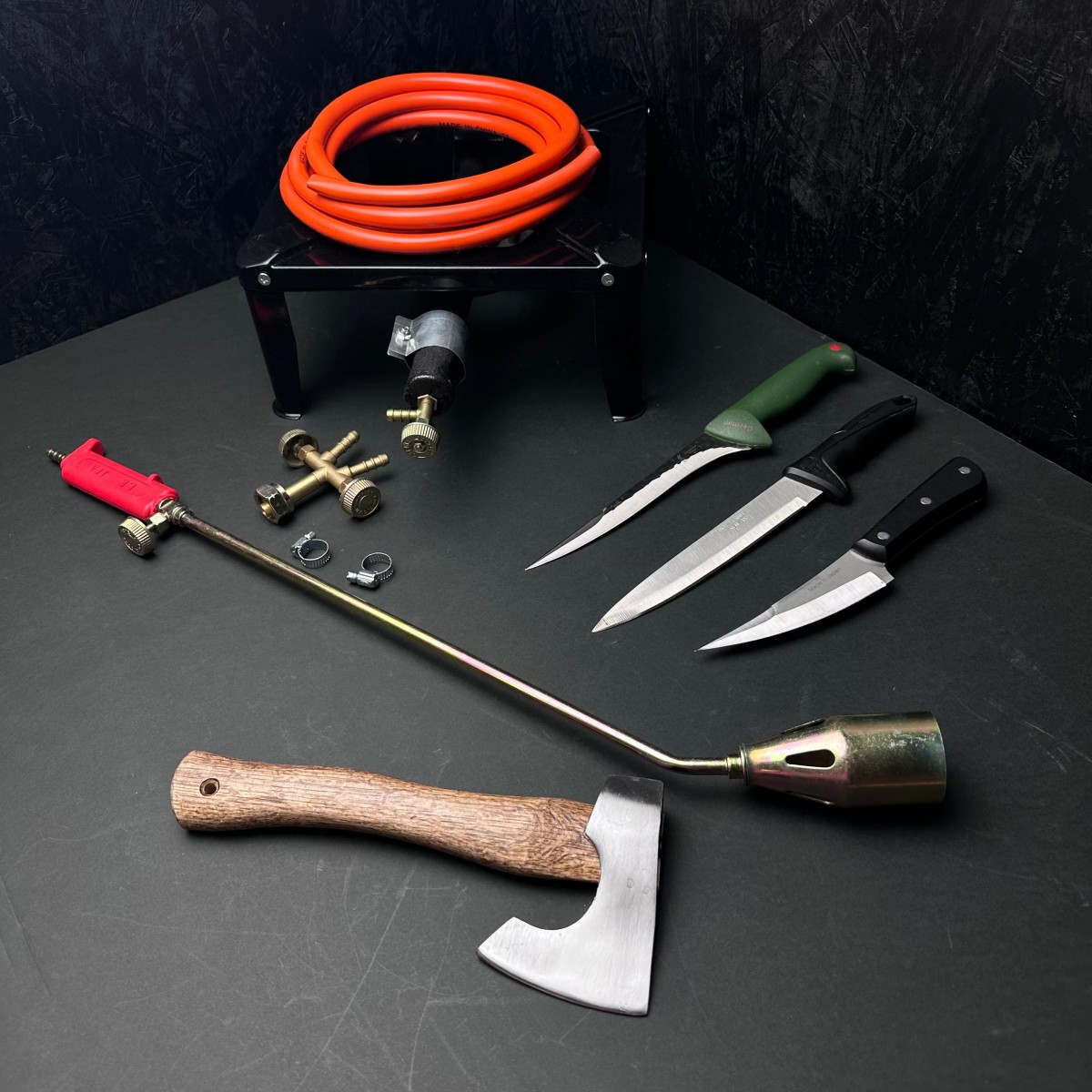 Set complet și robust pentru sacrificare, tranșare și gătit în aer liber. Include arzător mare cu clapetă pentru pârlit, pirostrie stabilă pentru gătit tradițional și cuțite profesionale pentru toate etapele de lucru. Ideal pentru gospodării, ferme sau activități de camping și gătit la foc deschis.