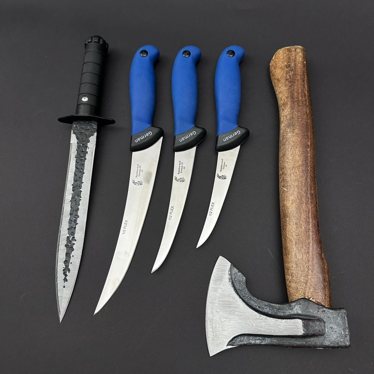 Set Măcelărie Profesional SLNA 5 Piese – Toporișcă, Cutit fier forjat i9FF, 3 Cuțite Oțel Inox 1/2 Flex, Mâner Silicon albastru.